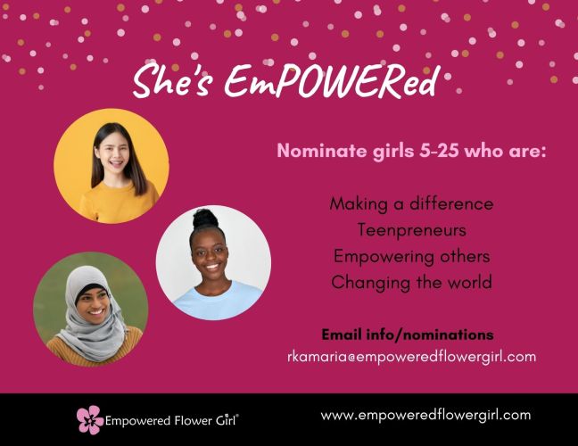 Do you know a young social entrepreneur or change maker (who identifies as female) from 5 to 25, let us know. We’ll highlight her in the next issue of Be EmPOWERed. Email details (name, age, city and up to 100 words on why your nominee should be selected) to rkamaria@empoweredflowergirl.com.