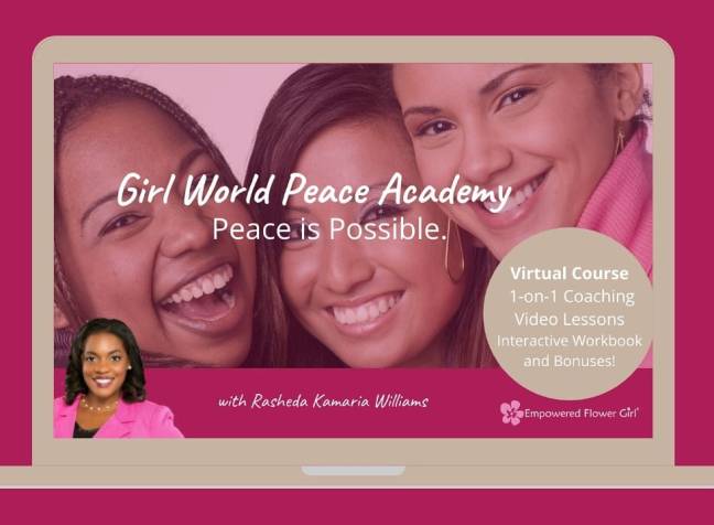 One other resource that Empowered Flower Girl offers is Girl World Peace Academy – a virtual course and coaching program for adults who aspire to make a difference for young people in their schools and communities.